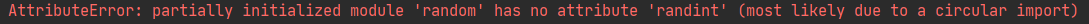 AttributeError: partially initialized module 'random' has no attribute 'randint' (most likely due to a circular import)